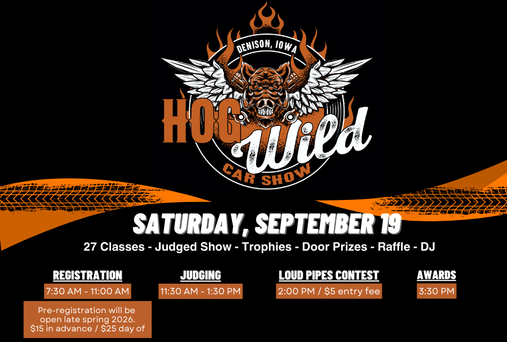 The Hog Wild Car Show is one of the most exciting features of the Tri City BBQ Fest. With up to 250 cars participating in beautiful Uptown Denison, there is plenty to see and do in between admiring the unique, beautiful and pampered vehicles. With a loud pipes contest, 28 different classes to compete in, Dash Plaques provided to the first 150 entries, door prizes, and trophies awarded to the best 3 in each class, you won’t want to miss this show!